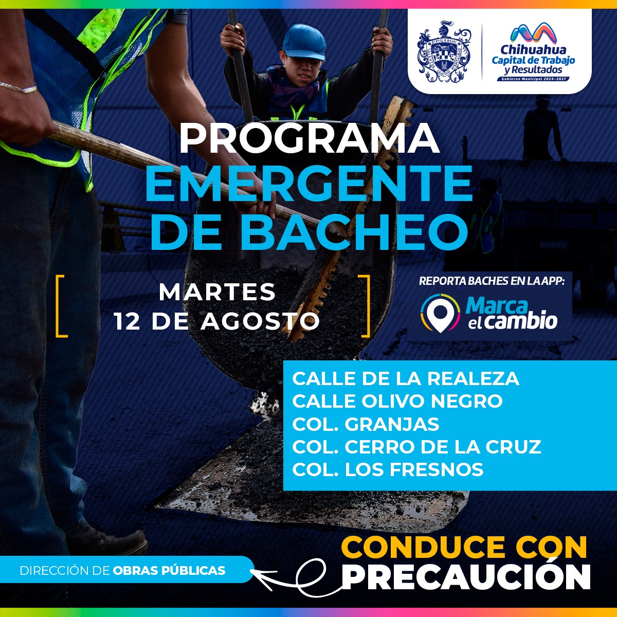 El Gobierno Municipal, a través de la Dirección de Obras Públicas realizará trabajos de bacheo mediante el programa emergente en las calles: De la Realeza y Olivo Negro, así como en las colonias: Granjas, Cerro de la Cruz y Los Fresnos.