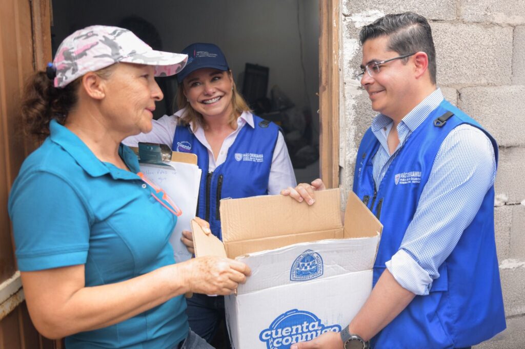 La mandataria visitó las viviendas de adultos mayores, madres jefas de familia y vecinos en situación de vulnerabilidad, a quienes entregó apoyos diversos como láminas, polín, hule, kits de limpieza y artículos de higiene personal, así como despensas.