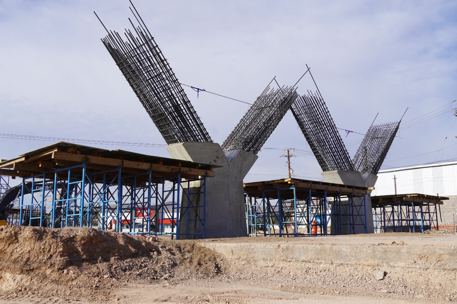 Como parte de la ejecución de esta importante solución vial para las y los habitantes de Chihuahua Capital, las cuadrillas trabajan en distintos frentes, entre los que destacan el cimbrado y colado de columnas y glorieta, así como la colocación de piezas de concreto para muros de tierra armada en las rampas de acceso.