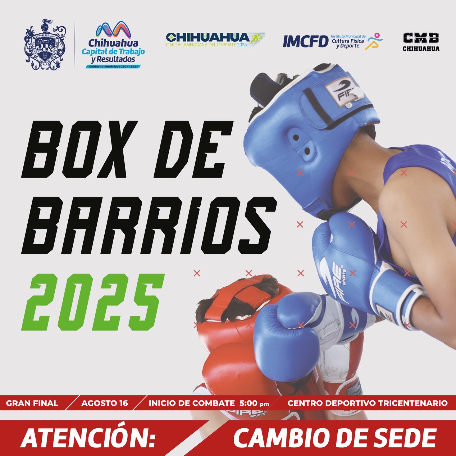 El Gobierno Municipal de Chihuahua, a través del Instituto Municipal de Cultura Física y Deporte (IMCFD), informa que la gran final del Torneo Box de Barrios se llevará a cabo este sábado 16 de agosto en el gimnasio del Centro Deportivo Tricentenario.