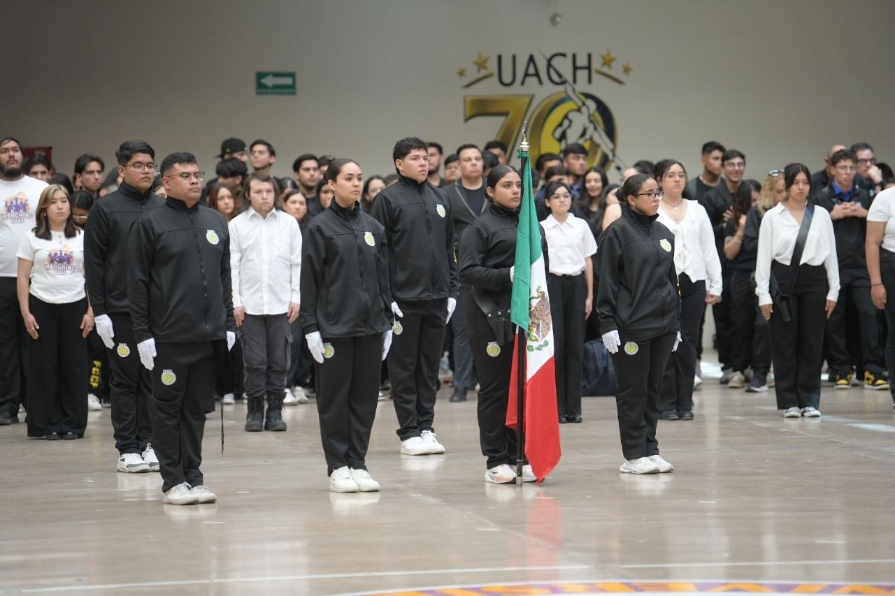 El rector de la UACH, Mtro. Luis Alfonso Rivera Campos destacó el orgullo que representa portar el lábaro patrio e integrar una escolta universitaria, al tiempo que reconoció la evolución de la antigua Escuela de Educación Física hasta convertirse en la actual Facultad de Ciencias de la Cultura Física. Exhortó a la comunidad a continuar con entusiasmo ante los retos venideros. Durante el evento, también se develó un mural realizado por estudiantes de la Facultad de Artes, como parte de la conmemoración del 70 aniversario.