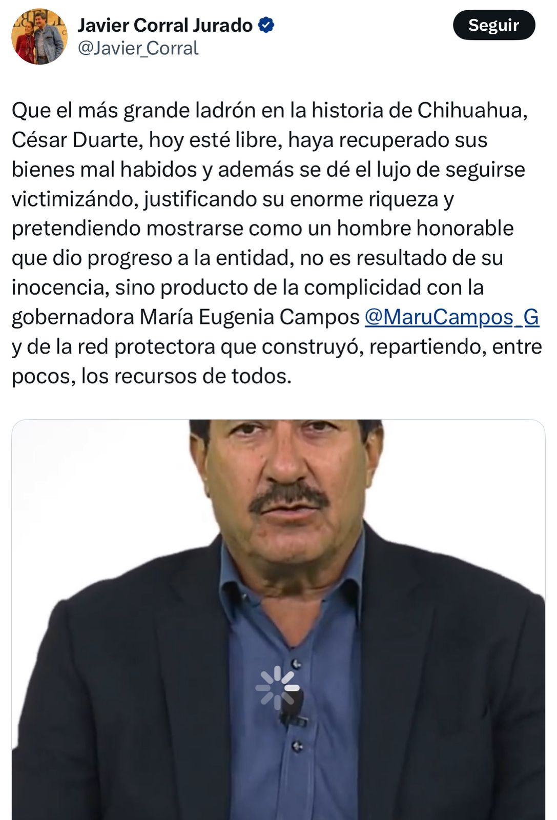 “Que hoy esté libre, haya recuperado sus bienes mal habidos y además se dé el lujo de seguirse victimizando, justificando su enorme riqueza y pretendiendo mostrarse como un hombre honorable que dio progreso a la entidad, no es resultado de su inocencia, sino producto de la complicidad con la gobernadora @MaruCampos_G y de la red protectora que construyó, repartiendo entre pocos los recursos de todos”, escribió Corral.