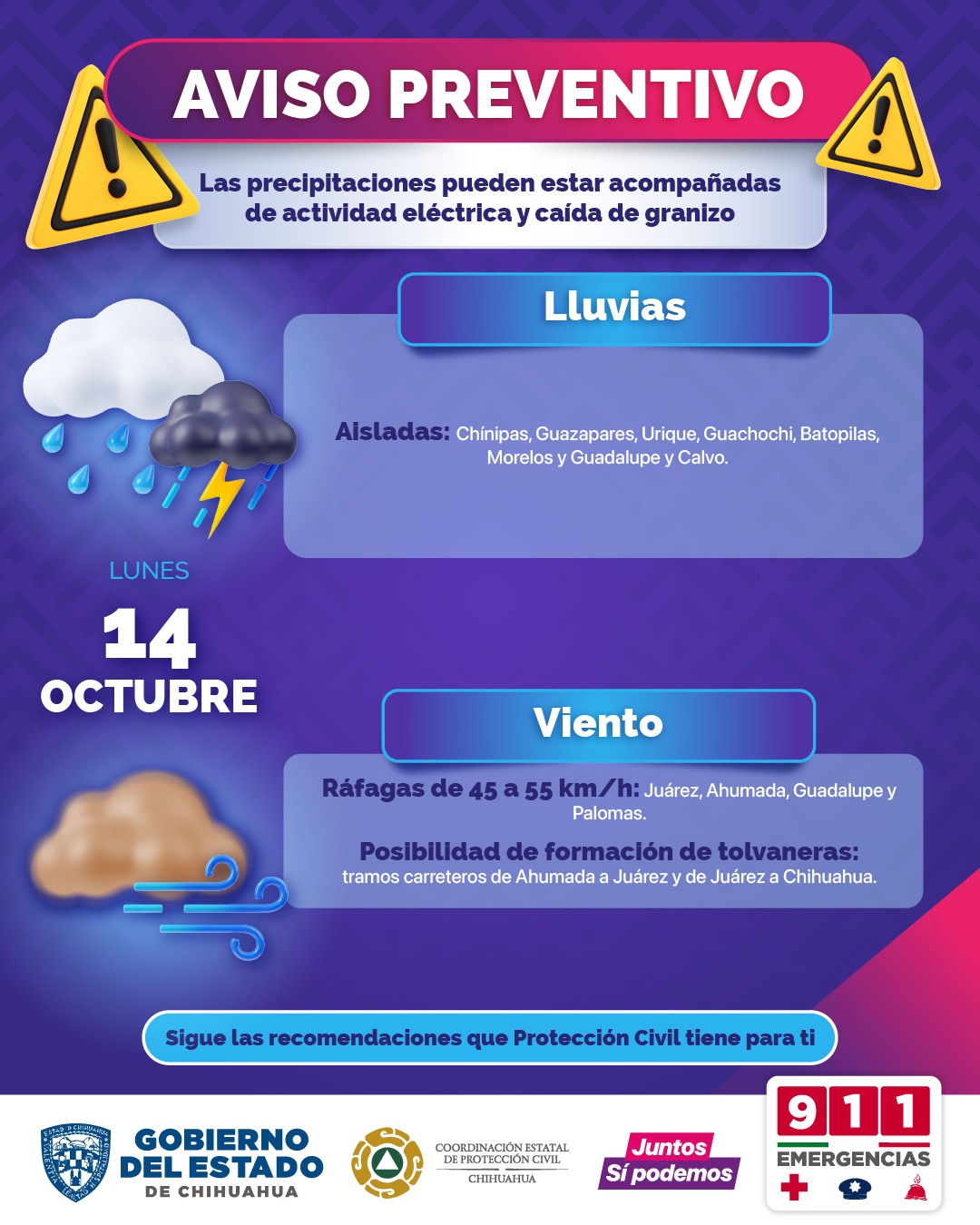 Para la tarde de este lunes 14 de octubre, se prevén vientos con ráfagas que pueden superar los 35 kilómetros por hora (km/h) en Juárez, Guadalupe, Ahumada, Janos, Casas Grandes, Madera, Ignacio Zaragoza, Gómez Farías, Temósachic, Guerrero, Cuauhtémoc, López y Coronado.