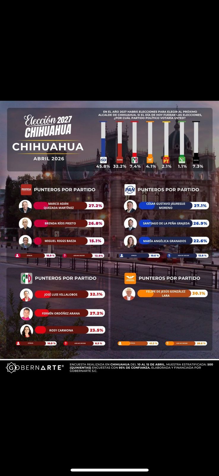 En cuanto a otros partidos, el bloque de Morena presenta una contienda cerrada encabezada por Marco Adán Quezada Martínez con 27.2%, seguido de Brenda Ríos Prieto con 26.8%, mientras que Miguel Riggs Baeza alcanza el 15.1%. Por el PRI, José Luis Villalobos lidera con 32.1% al interior de su partido.