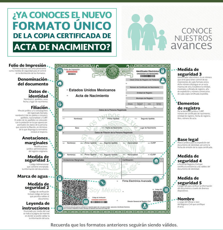 El nuevo formato del acta de nacimiento incluye todos los datos básicos de registro e identidad de los ciudadanos, así como de sus padres o tutores. Además, incorpora medidas de seguridad avanzadas para prevenir alteraciones y garantizar su autenticidad.