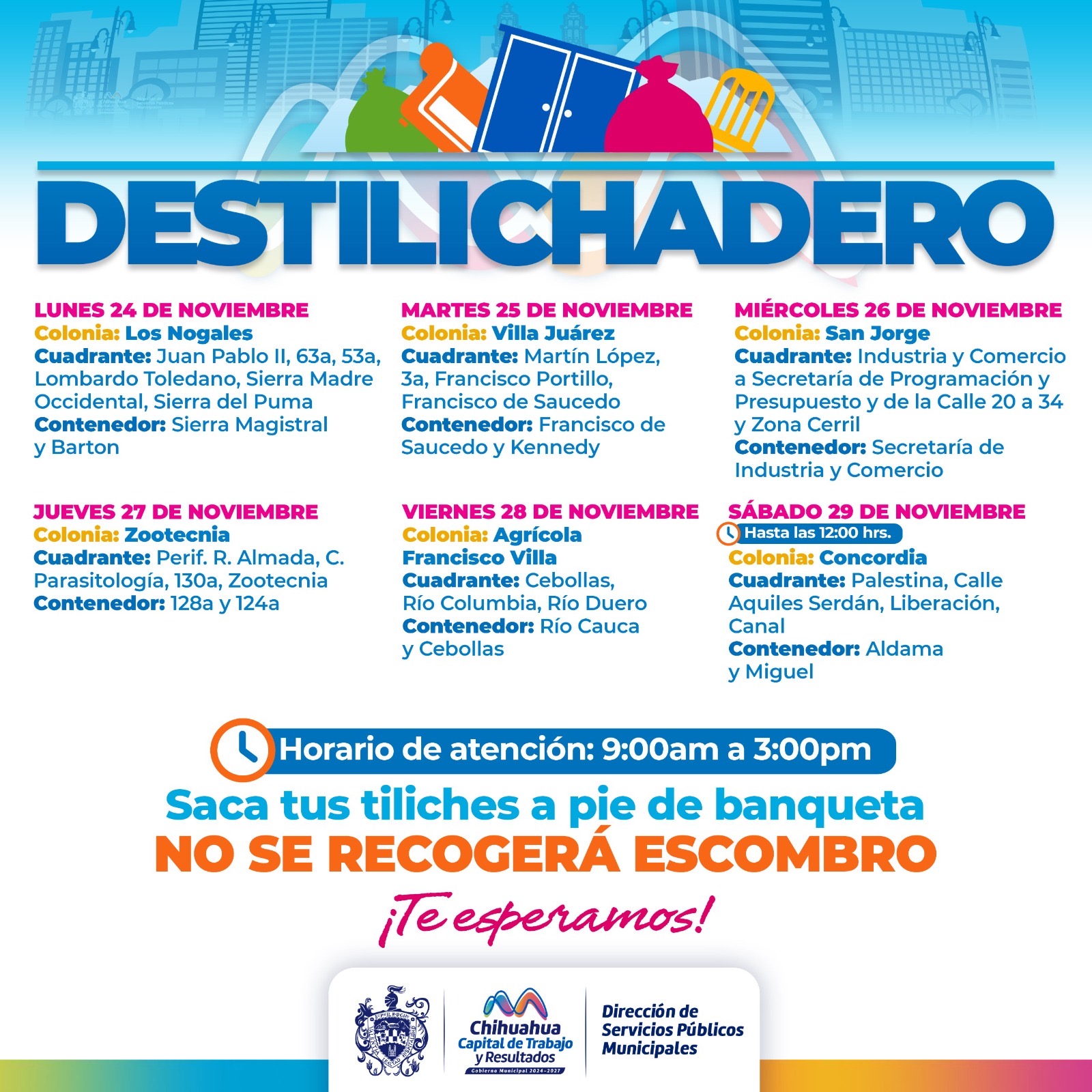 H. Ciudad de Chihuahua, Chih., a 22 de noviembre de 2025.- Para evitar acumulaciones de basura de grandes dimensiones en las viviendas, que podría generar plagas o problemas de salud, el Gobierno Municipal, a través de la Dirección de Servicios Públicos Municipales, informa el calendario del programa Destilichadero, que se realizará en seis de colonias de la Capital del 24 al 29 de noviembre.