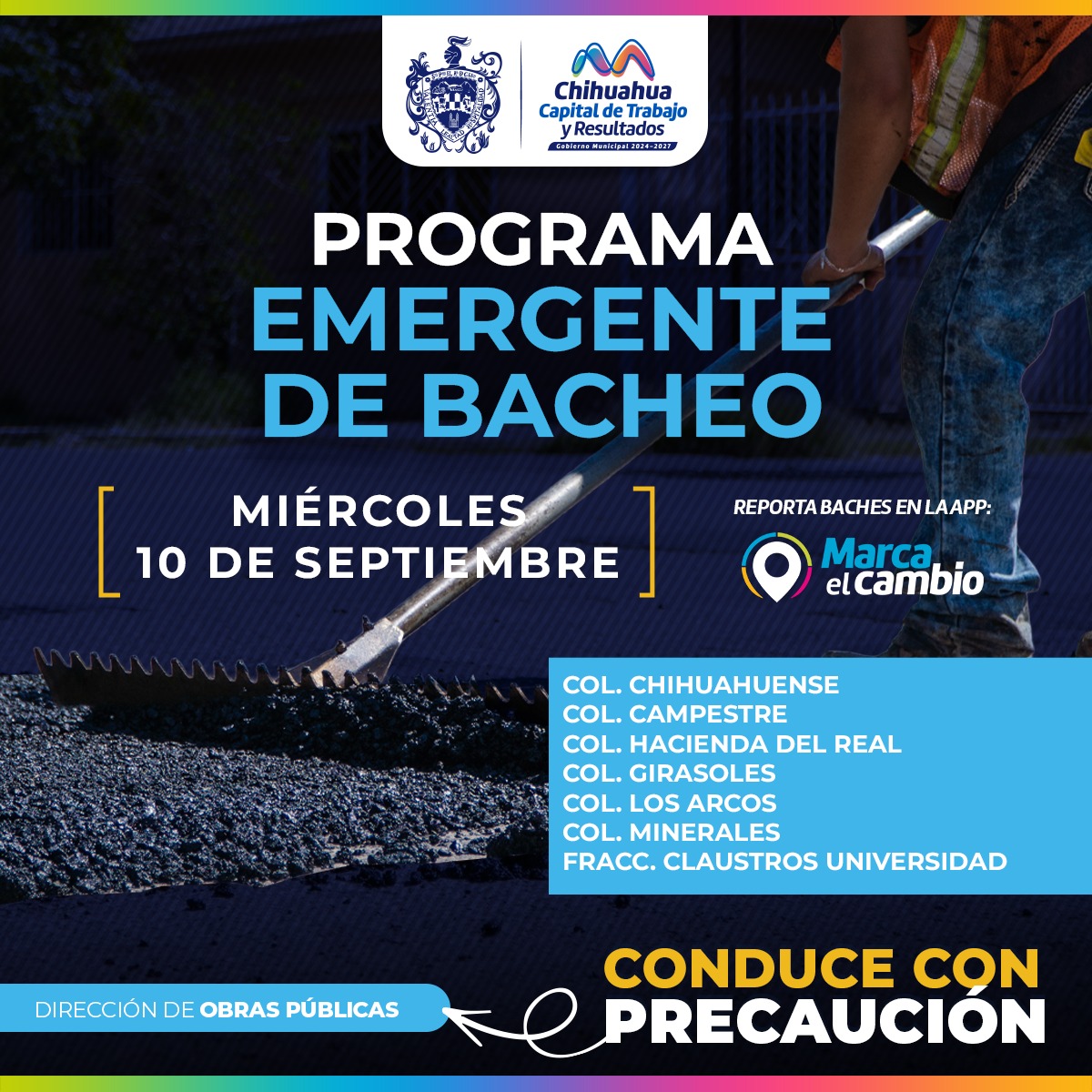 El Gobierno Municipal, a través de la Dirección de Obras Públicas, realizará trabajos de bacheo este 10 de septiembre, mediante el programa emergente, en las colonias Chihuahuense, Campestre, Hacienda del Real, Girasoles, Los Arcos, Minerales y en el Fraccionamiento Claustros Universidad.