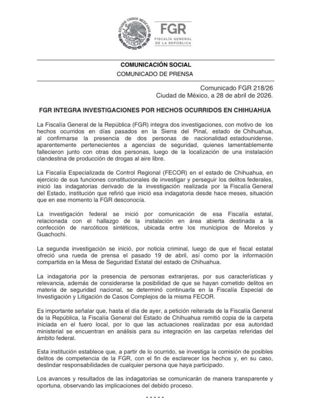 La Fiscalía General de la República (FGR) informó este martes que inició dos investigaciones por los hechos ocurridos en Chihuahua, por el caso de los agentes estadounidenses muertos en el estado el pasado domingo 19 de abril.