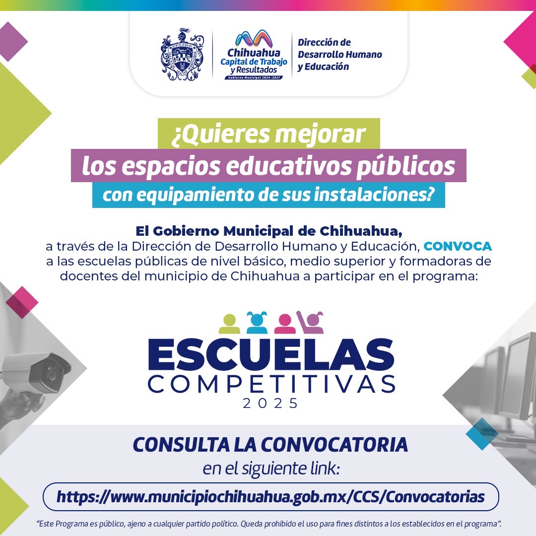 El Gobierno Municipal, a través de la Dirección de Desarrollo Humano y Educación, invita a instituciones educativas públicas de nivel básico, medio superior y formadoras de docentes de la ciudad a participar en el Programa Escuelas Competitivas 2025, para contribuir a mejorar las condiciones de aprendizaje mediante el equipamiento de las escuelas.