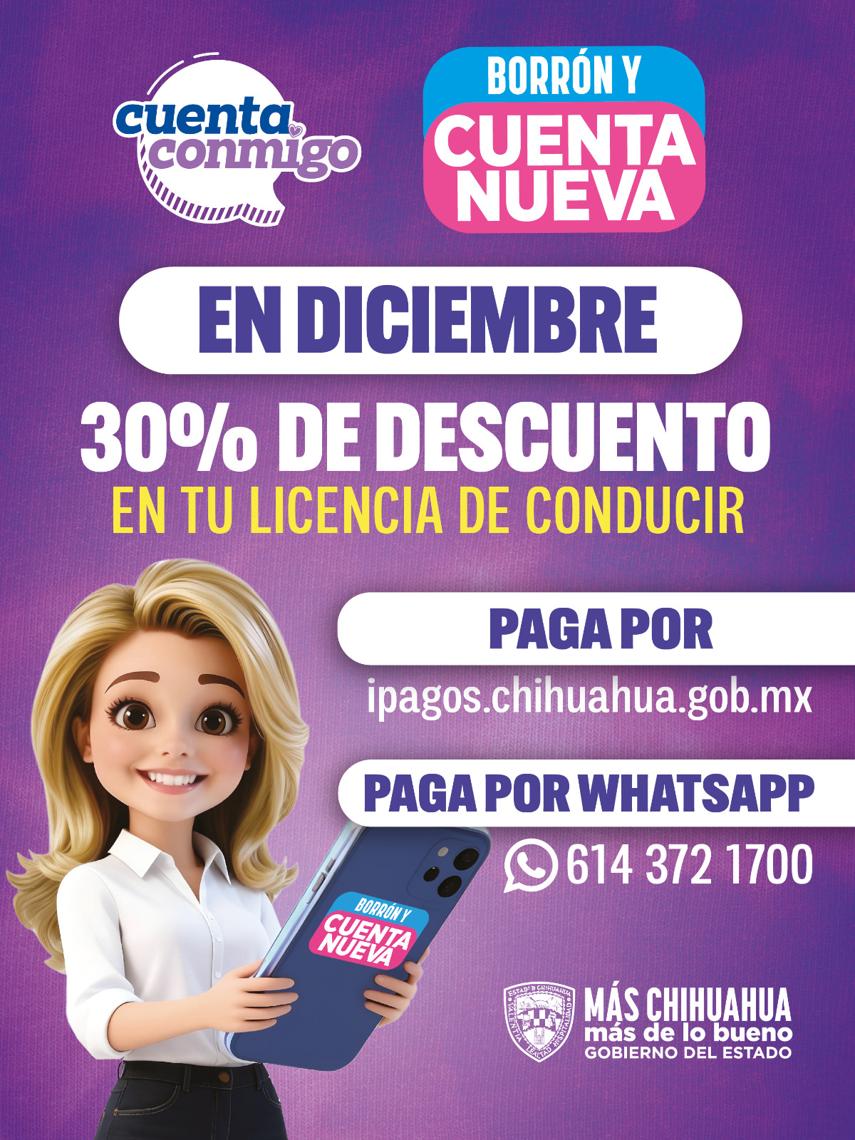 También directamente en cualquier recaudación de Rentas; o desde casa a través de la cuenta oficial de Facebook Facebook.com/ShGobChih y mediante el WhatsApp oficial (614) 372-17-00.