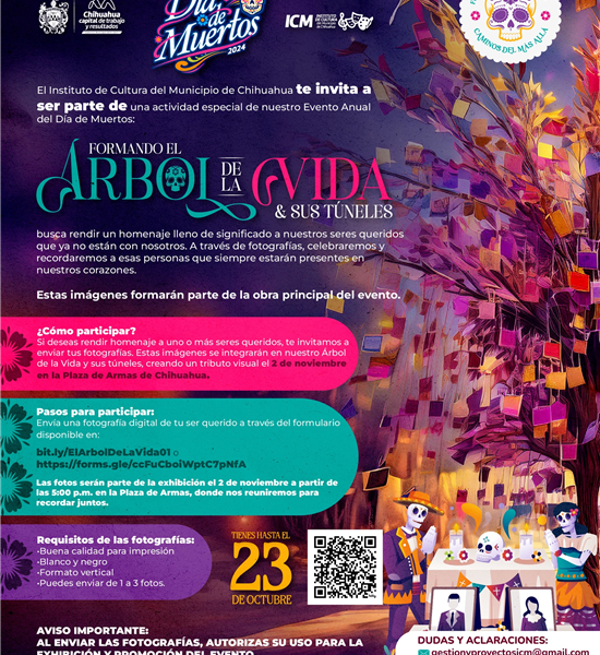 El Instituto de Cultura del Municipio de Chihuahua, invita a ser parte del Festival de Día de Muertos 2024 con el “Árbol de la Vida y...