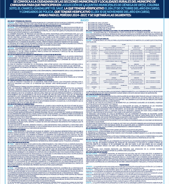 El Gobierno Municipal de Chihuahua, a través de la Dirección de Desarrollo Rural, ha emitido la convocatoria para la elección de las Juntas Municipales y Comisarías...