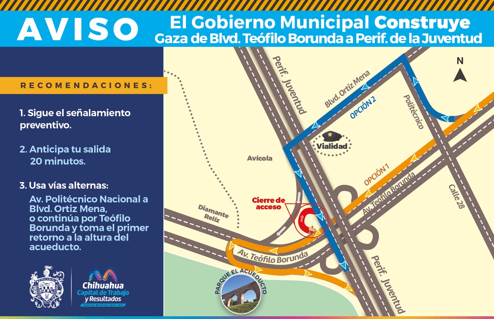 H. Ciudad de Chihuahua, Chih., a 3 de marzo de 2026.- El Gobierno Municipal, a través de la Dirección de Obras Públicas, informa que, a partir del próximo lunes 9 de marzo, cerrará la rampa de incorporación de la avenida Teófilo Borunda al Periférico de la Juventud, en sentido norte-sur, debido a la construcción del soporte del arco de la Gaza de Incorporación.