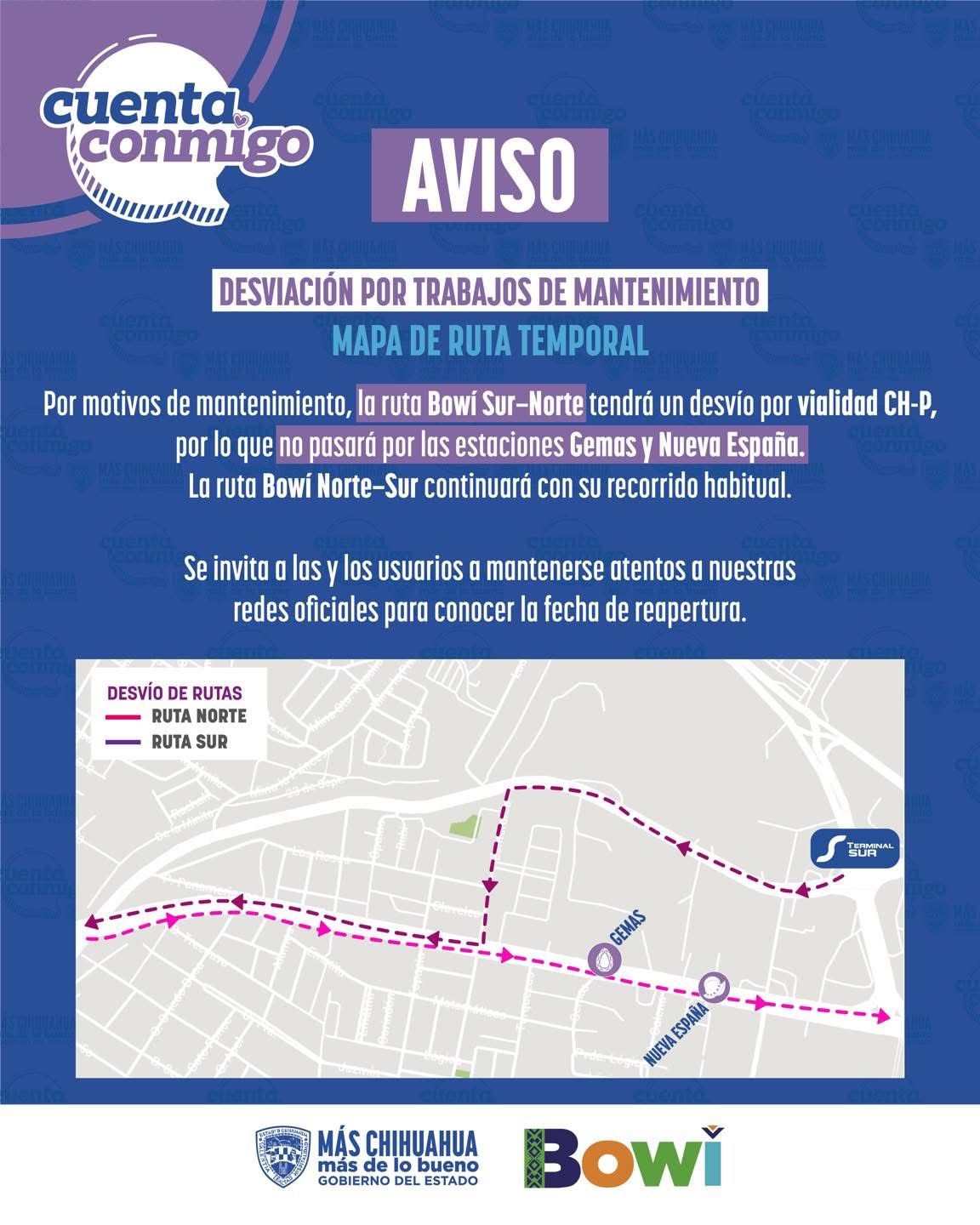 Chihuahua.– El Gobierno del Estado informó que, debido a labores de mantenimiento, la ruta Bowí en el sentido Sur–Norte modificará su recorrido de manera temporal y circulará por la vialidad CH-P, por lo que no dará servicio en las estaciones Gemas y Nueva España.