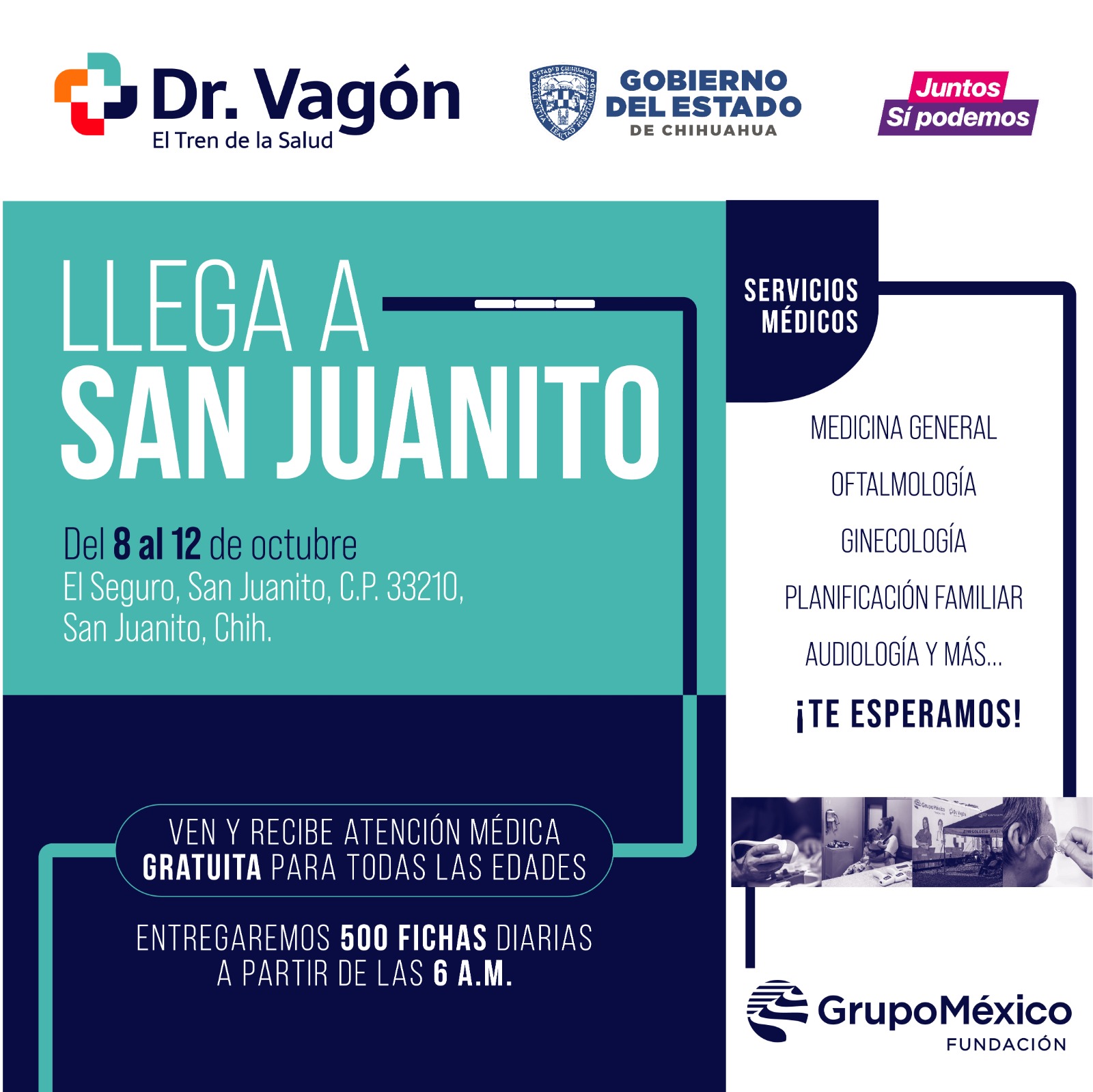 “El Dr. Vagón, el Tren de la Salud”, arribará mañana a la localidad de San Juanito, municipio de Bocoyna, en donde permanecerá hasta el próximo sábado para otorgar 500 citas médicas diarias a igual número de personas, que requieran de alguna atención especializada.